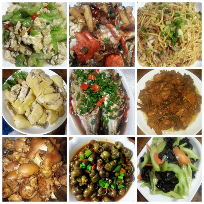 農家樂特色菜主要有:土雞煲,石斑魚,石筍,石雞,三石一雞、“咸肉筍”、“野味(野兔、野雞、野豬肉、竹雞等)”、“農家草雞”、“野蔥炒蛋”、“野生五香菜”、“野生蕨菜”、“泉水魚頭”等等。